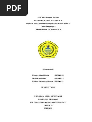 Soal dan jawaban bab 16. Formation operation and changes in membership answers to questions q15 1 partnerships are a popular form of business because they are easy to form informal methods of organization and because they allow several. kunci jawaban auditing dan jasa assurance jilid 1 arens. Feny nur fitri (344439) fatonah nur hidayah (344921) wahyu dewi purnamasari (344945) puji utami (345032) peni purnawati (350795) program diploma ekonomika dan bisnis sekolah vokasi universitas gadjah mada 2015 fsoal pilihan ganda: Metodologi untuk perancangan pengujian • bukti yang tepat harus diperoleh dari rincian saldo harus diputuskan tujuan demi tujuan.